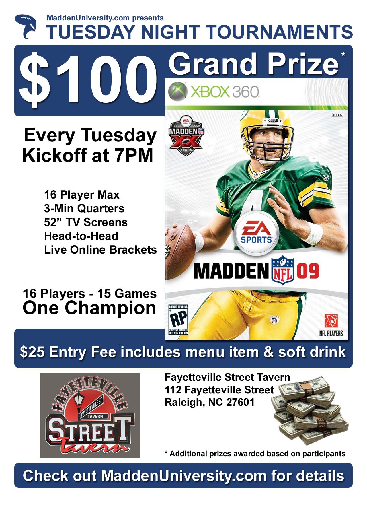Tuesday nights in Raleigh, NC were lit back in February 2009 as Madden players battled at Fayetteville Street Tavern for weekly Madden NFL showdowns that blended competition, community, and food. Hosted in partnership with the Capital City Ballers and MaddenUniversity.com, the Tuesday Night Tournaments (TNT) helped define Raleigh’s local Madden scene and featured a $100 winner-take-all format, real-time scoring, and a low $25 entry fee that included a menu entrée. Check our how the TNT redefined cometition in Raleigh, NC.