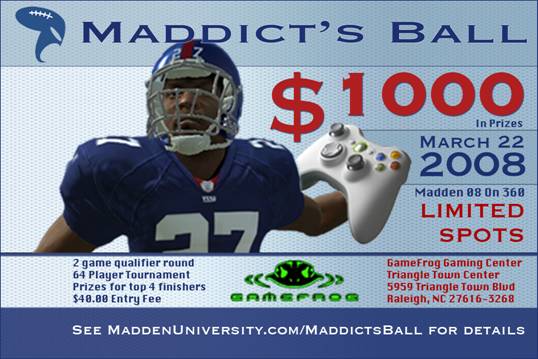 The Madden scene lit up Cary, NC as top players from Boston to Florida clashed at Maddict’s Bash, a $3,000 prize tournament hosted at GameFrog in Cary Towne Center on April 26, 2008. Elite talent, rising stars, and future EA developers were in the mix for high-stakes drama and unforgettable matchups. Mr. Magic City again met OneGreatUser on the championship match, as Young Nephew rounded the awards podium in this milestone of competitive Madden history.